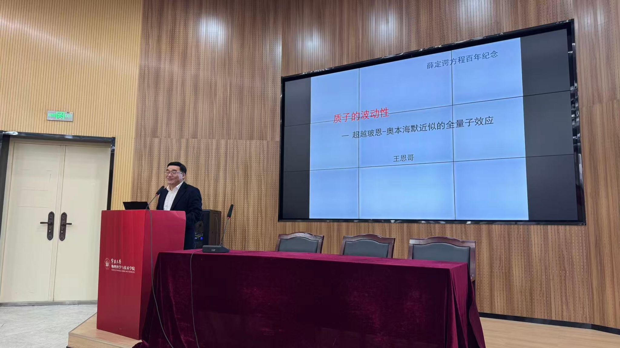 3月31日,物理科学与技术学院在龙赛报告厅举办“格物·鼎新——成人在线 40周年庆物理前沿系列高峰讲坛”首场报告,中国科学院院士、北京大学教授王恩哥应邀为学院师生作题为“超越玻恩-奥本海默近似的全量子效应研究”的学术报告。本次报告会由校长蔡荣根院士主持,学院党政班子成员及200余名师生参加。