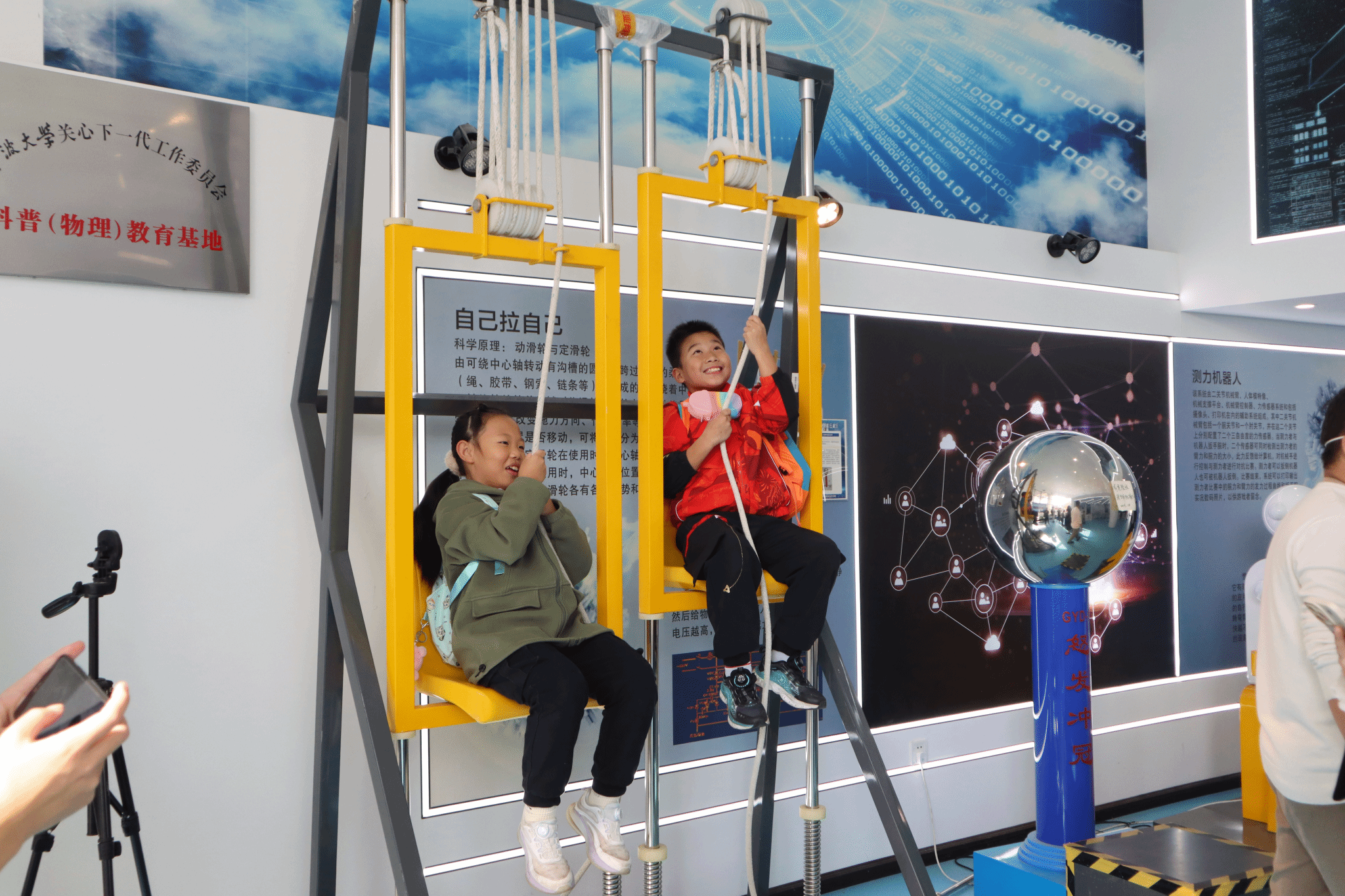 活动伊始,孩子们在科探中心的自由体验区中尽情释放好奇心。从随温度“变形”的记忆合金,到荧光画笔绘出的光影魔法;从潮汐发电模拟装置的能源转化展示,到“自己拉自己”的趣味互动设施,每一个展品都成为孩子们动手实践、认真观察的“科学课堂”。他们化身“小研究员”,在自由探索中感受科学的魅力。
