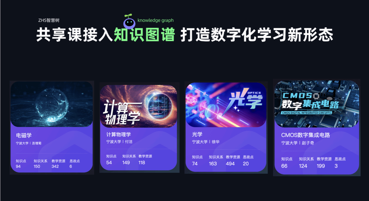 在人工智能与教育深度融合的今天,宁波大学物理科学与技术学院迎来了教育教学数字化转型的新篇章。学院首批建设的5门知识图谱AI课程中已有4门正式与共享课MOOC互联,并于3月份上线智慧树平台共享运行。目前已吸引来自10多所高校的1498名学生在知识图谱AI课程中探索学习。这次与MOOC的链接,不仅是学院课程资源共享的里程碑,更是学院推动教育公平、促进知识普及化、知识体系化、资源结构化建设的重要举措。