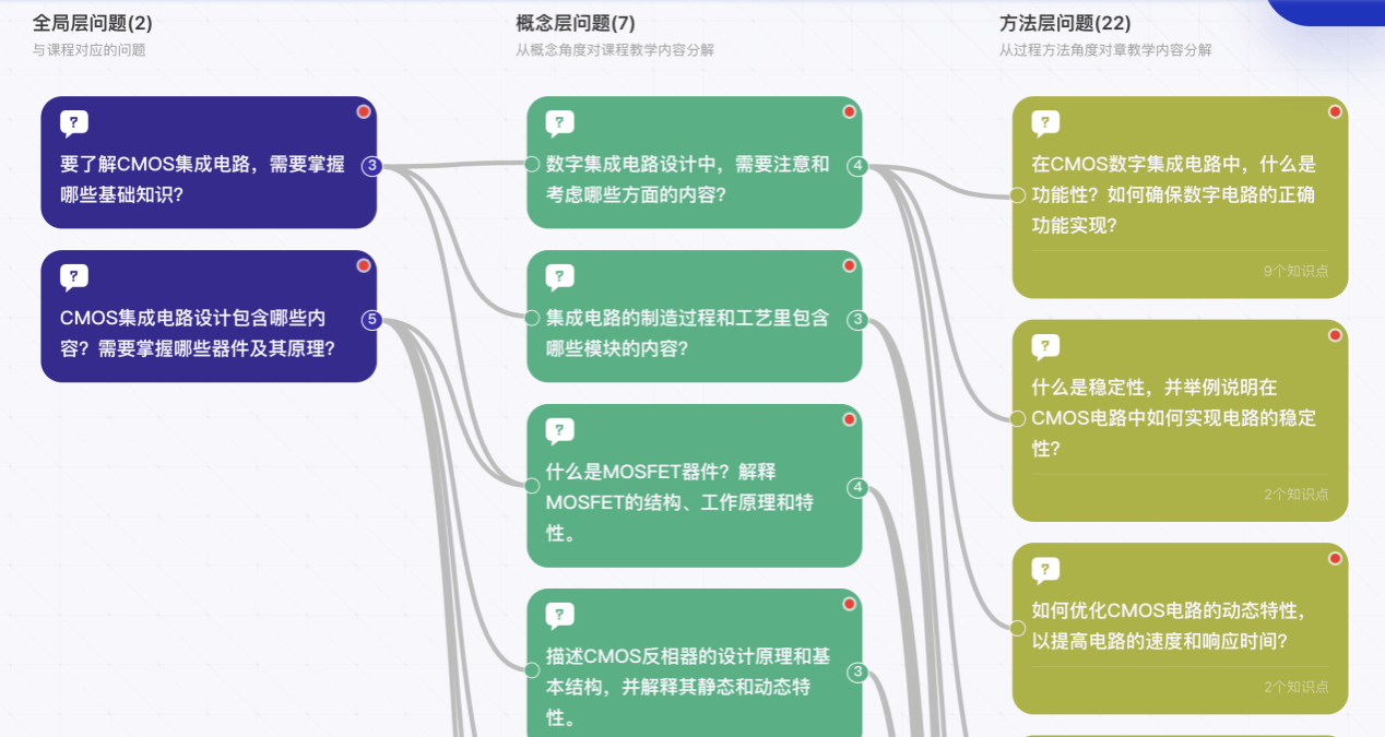 同时,梳理了每门课程典型性全局层问题,逐步拆解为概念层问题和方法层问题,再将问题与知识点进行关联,让学生能够在实际学习活动中不断优化和更新问题图谱,培养其观察事物、分析问题和逻辑思维的能力以及获取新知识,利用所学知识解决实际问题的能力。