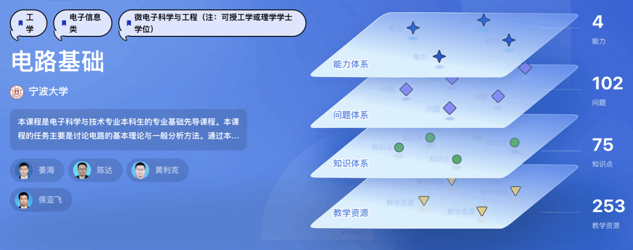 在知识图谱AI课程筹划和建设的过程中,各课程团队成员和智慧树团队一起研讨教学创新亮点,他们运用丰富的案例、互动讨论和在线实验等方式,让学习过程既富有挑战性又充满乐趣。团队聚焦课程目标、知识框架、学习逻辑等关键问题,拆解、细化专业知识。结合教学实施情况,“电磁学” 知识图谱AI课程系统搭建了7项能力目标,梳理了75个问题,94个知识点,构建了150个知识关系,拓展了342个教学资源;“计算物理学” 知识图谱AI课程系统搭建了4项能力目标,梳理了31个问题,54个知识点,构建了149个知识关系,拓展了118个教学资源;“光学” 知识图谱AI课程系统搭建了3项能力目标,梳理了114个问题,72个知识点,构建了156个知识关系,拓展了509个教学资源;“电路基础”知识图谱AI课程系统搭建了4项能力、梳理了102个问题,75个知识点,构建了131个知识关系,拓展了253个教学资源;“CMOS数字集成电路”知识图谱AI课程系统搭建了7项能力目标、梳理了31个问题,66个知识点,构建了127个知识关系,拓展了199个教学资源。每门知识图谱AI课程均包含教学资源层、知识体系层、问题体系层、能力体系层等4个维度,将每门课程的知识点有机地联系在一起,形成了一个完整的、多维度的知识网络,帮助学生全面掌握课程知识体系,加强对物理科学与技术学院专业核心课程的本质认识。