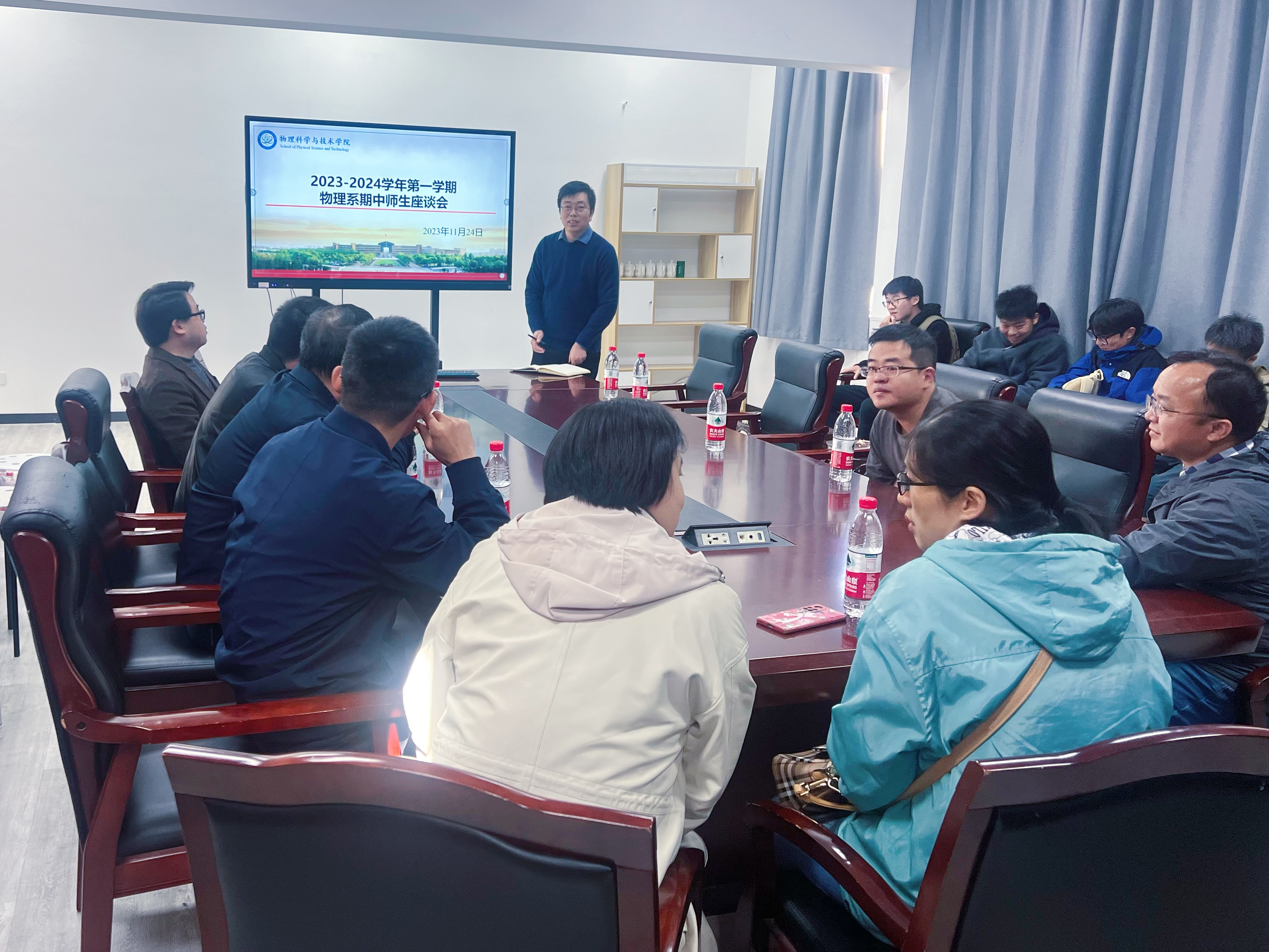 11月24日中午,物理系在龙赛理科楼北楼228会议室召开了物理系期中教学师生座谈会,会议由系主任汤世伟老师主持,物理系教师代表、教务办老师、学工办老师和二十余位学生代表参加了本次座谈会。