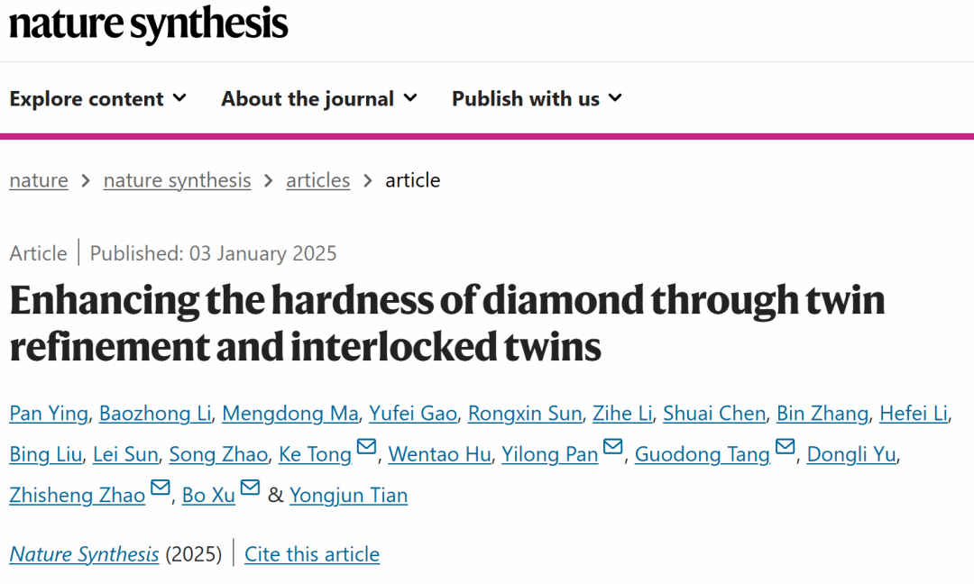 近日,我院潘益龙研究员联合燕山大学高压科学中心田永君院士团队及南京理工大学研究人员在超硬材料领域实现重大突破:成功合成出硬度达276 GPa的超细纳米孪晶金刚石块材,继合成具有突破性硬度各向异性的金刚石块材后(发表于PNAS,原文链接://doi.org/10.1073/pnas.2108340118),再次刷新了材料硬度的世界纪录。相关研究以“Enhancing the hardness of diamond through twin refinement and interlocked twins” 为题。于2025年1月3日在《Nature Synthesis》在线发表(原文链接://doi.org/10.1038/s44160-024-00707-1)。