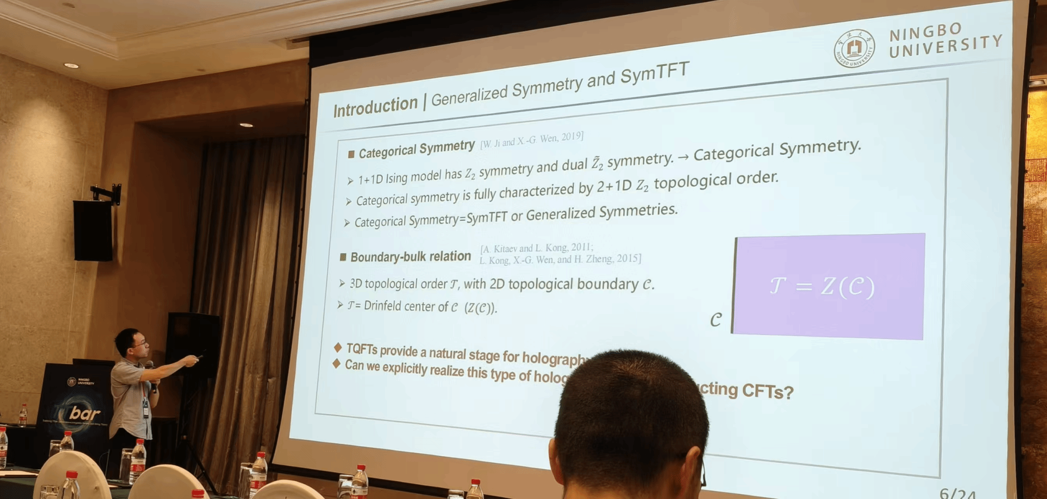 会议开幕式由基础物理与量子科技研究院的何松教授主持,研究院院长陈斌教授与Roberto Tateo教授相继致辞。他们首先对与会者的到来表示热烈欢迎,并简要回顾了宁波大学的发展历史,以及主办单位——基础物理与量子科技研究院在前沿理论物理领域的布局与发展,并诚挚邀请各位学者前来交流访问。三位教授强调了TTbar形变在量子场论和引力理论中的重要作用,指出其不仅是连通量子场论与引力的关键桥梁,更能为理解非微扰量子场论与黑洞物理开辟崭新视角。他们希望本次会议能够激发思想火花、凝聚学术共识,构建高水准的对话与协作平台。