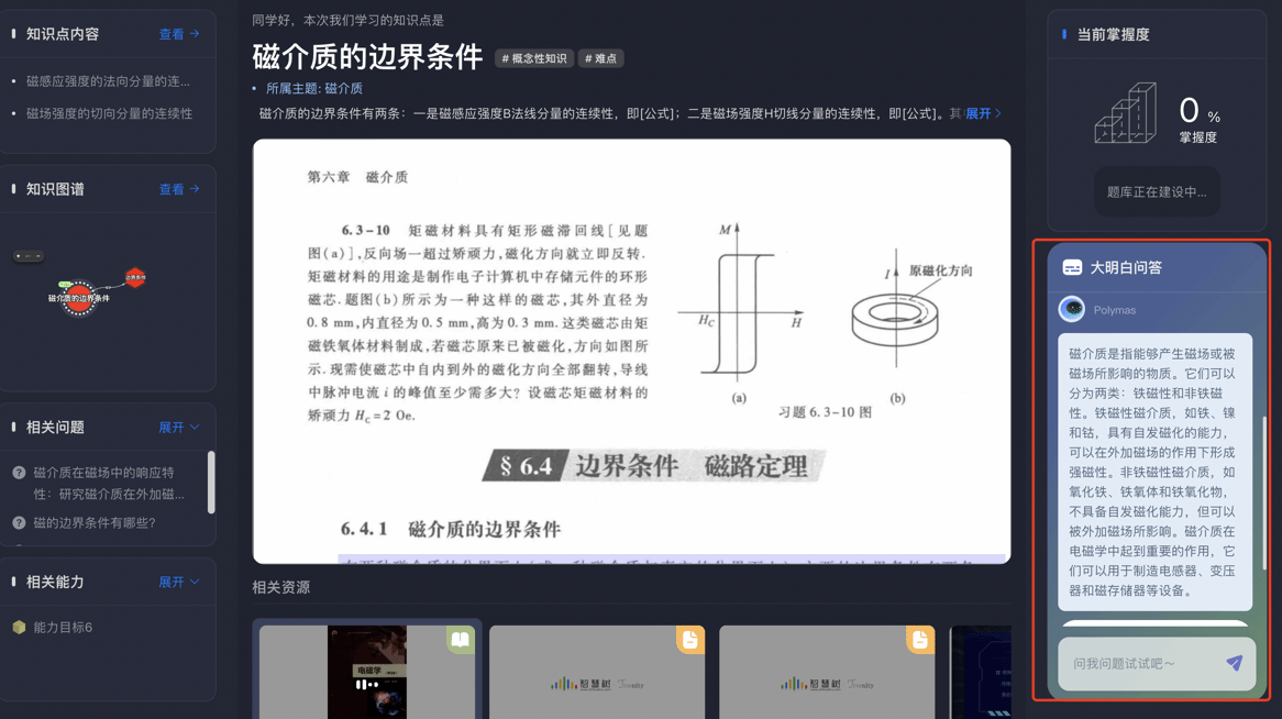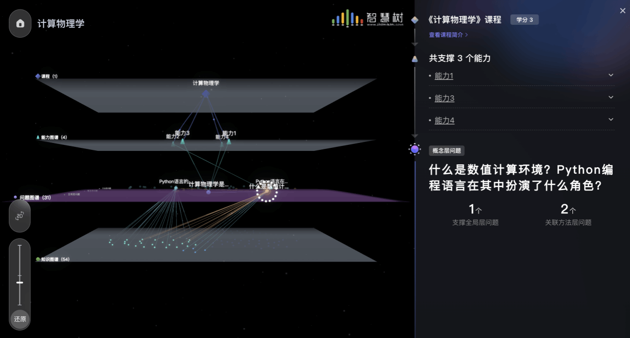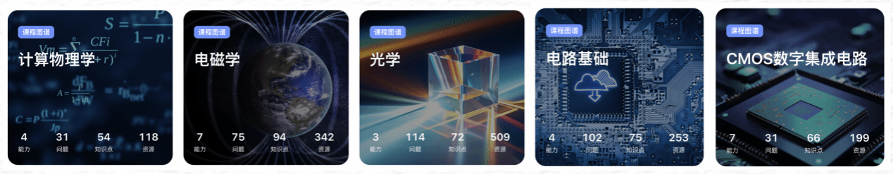 在知识图谱AI课程筹划和建设的过程中,各课程团队成员和智慧树团队一起研讨教学创新亮点,他们运用丰富的案例、互动讨论和在线实验等方式,让学习过程既富有挑战性又充满乐趣。团队聚焦课程目标、知识框架、学习逻辑等关键问题,拆解、细化专业知识。结合教学实施情况,“电磁学” 知识图谱AI课程系统搭建了7项能力目标,梳理了75个问题,94个知识点,构建了150个知识关系,拓展了342个教学资源;“计算物理学” 知识图谱AI课程系统搭建了4项能力目标,梳理了31个问题,54个知识点,构建了149个知识关系,拓展了118个教学资源;“光学” 知识图谱AI课程系统搭建了3项能力目标,梳理了114个问题,72个知识点,构建了156个知识关系,拓展了509个教学资源;“电路基础”知识图谱AI课程系统搭建了4项能力、梳理了102个问题,75个知识点,构建了131个知识关系,拓展了253个教学资源;“CMOS数字集成电路”知识图谱AI课程系统搭建了7项能力目标、梳理了31个问题,66个知识点,构建了127个知识关系,拓展了199个教学资源。每门知识图谱AI课程均包含教学资源层、知识体系层、问题体系层、能力体系层等4个维度,将每门课程的知识点有机地联系在一起,形成了一个完整的、多维度的知识网络,帮助学生全面掌握课程知识体系,加强对物理科学与技术学院专业核心课程的本质认识。