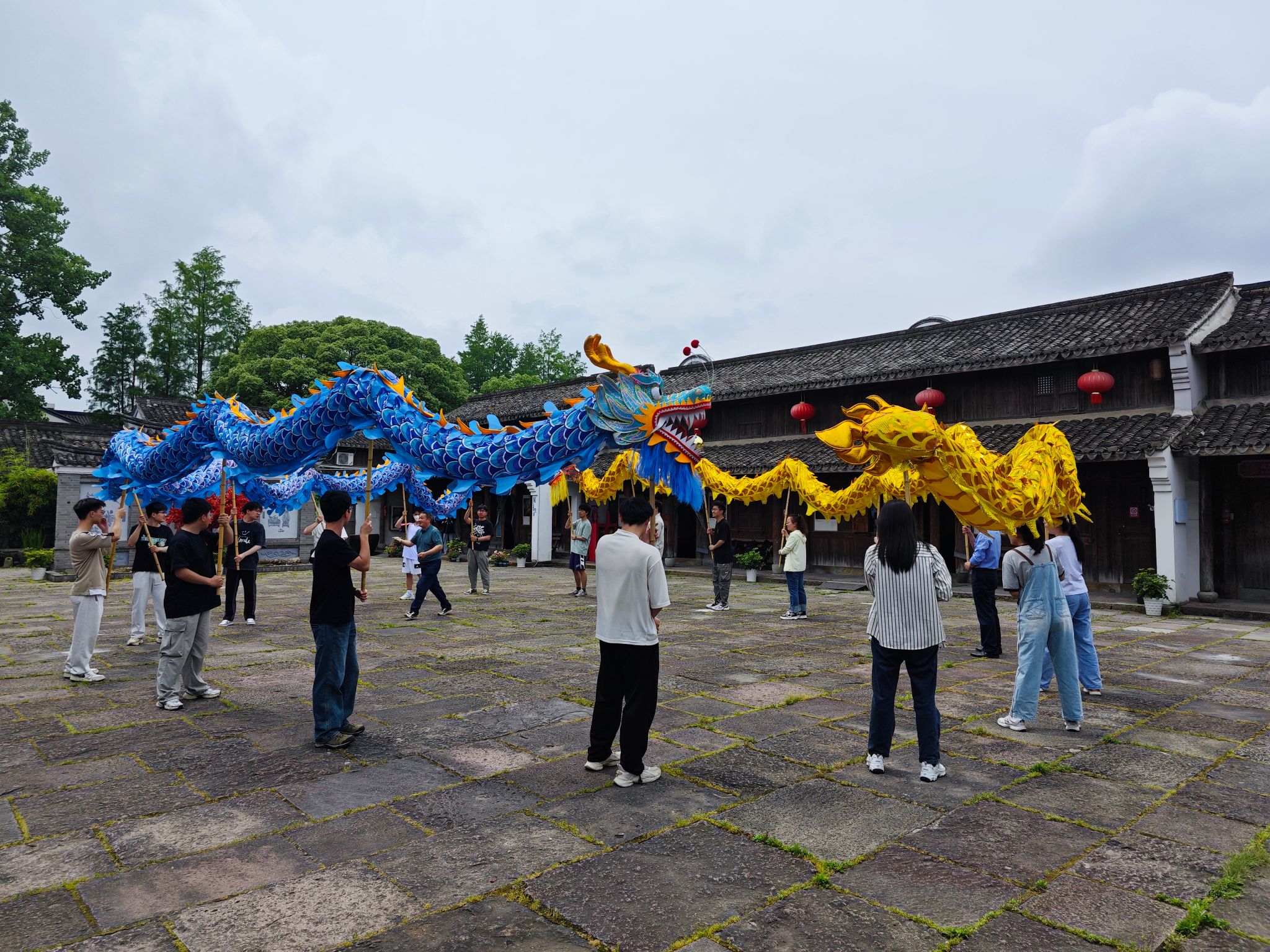 最后,师生一行前往西江古村的鄞州非遗博物馆,参观了鄞州竹编、金银彩绣、锦灰堆装裱和越窑青瓷等多种非遗传统技艺,“大岙布龙”第五代传承人任国夫老师热情地邀请同学们现场体验了一把舞龙的乐趣。