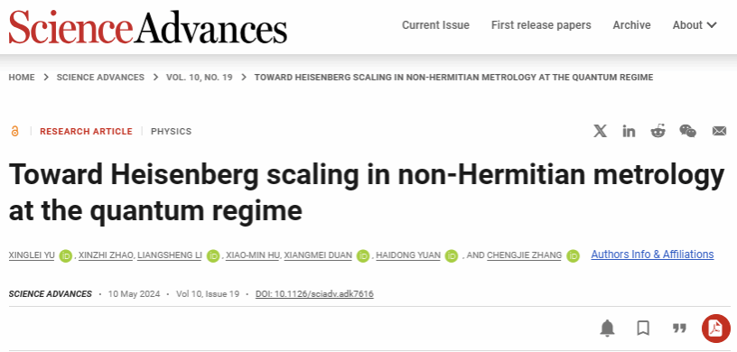 近日,成人在线 张成杰教授课题组在非厄米量子精密测量研究方面取得重要进展,提出了适用于非厄米系统的量子Fisher信息和最优测量条件,并实验研究了非厄米量子参数估计问题,估计精度达到海森堡标度。相关研究工作以“Toward Heisenberg scaling in non-Hermitian metrology at the quantum regime (迈向量子领域非厄米计量学中的海森堡标度)”为题,于2024年5月10日在国际著名期刊《Science Advances》(科学进展)上发表。