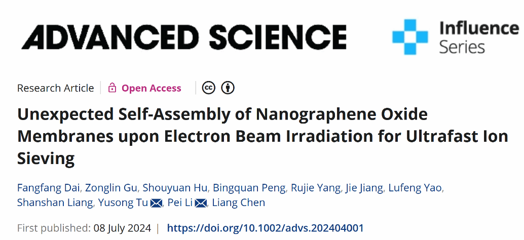7月8日,成人在线 微纳系统表面物理团队联合扬州大学、国科院温州研究院在国际知名期刊Advanced Science(IF:14.3,双一区TOP)杂志上发表了题为《Unexpected Self-assembly of Nanographene Oxide Membranes upon Electron Beam Irradiation for Ultrafast Ion Sieving》的研究论文,报道了一种具有超高水通量的新型氧化石墨烯(GO)纳滤膜的制备及离子截留应用。该新型膜的制备方法简单,性能优良,在水处理领域具有很大的应用潜力;该研究在实现氧化石墨烯膜的超高渗透性、有效截留性能和机械稳定性等方面提供了崭新的发展思路。