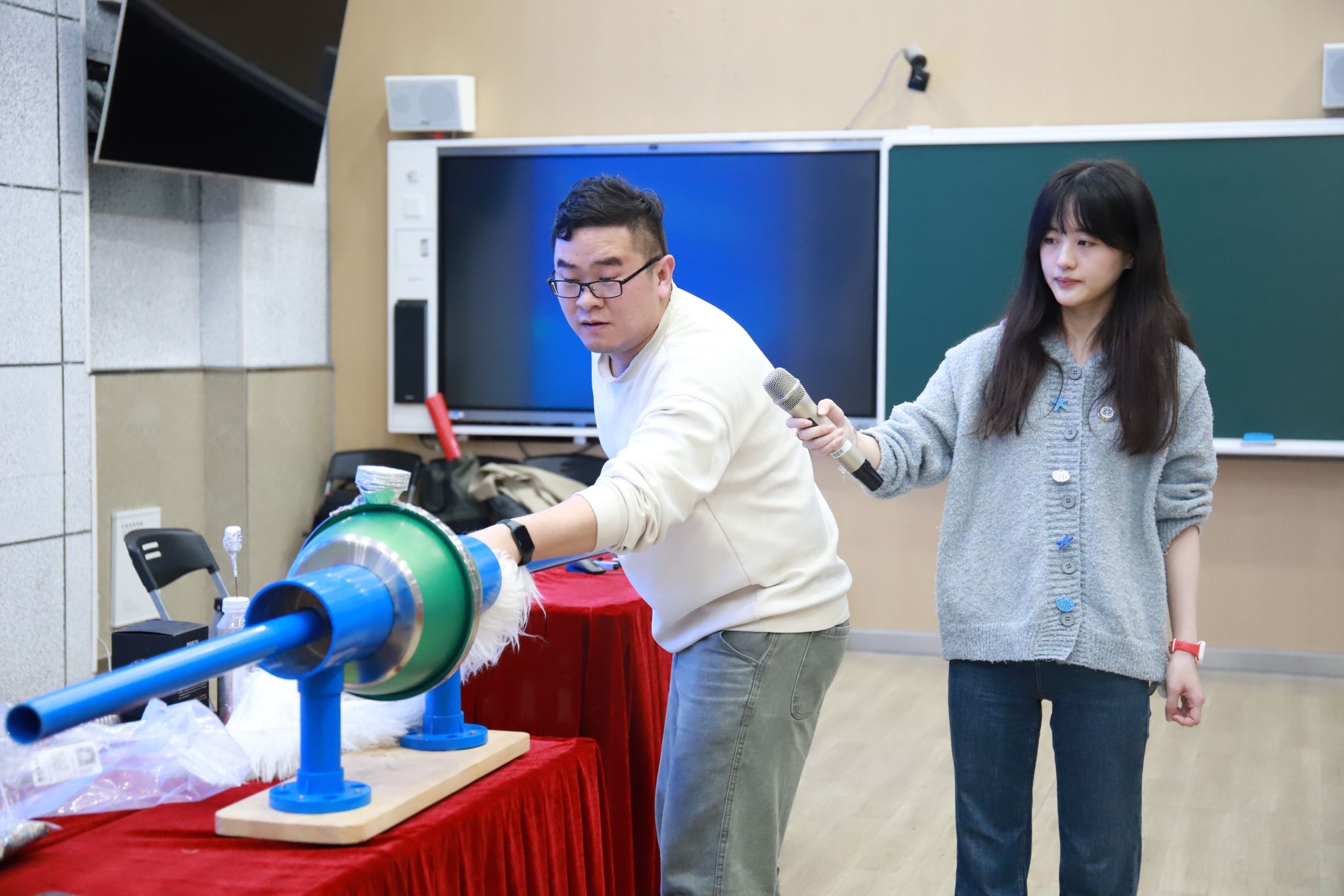 如何通过马德堡半球实验亲身感受大气压力?如何在炫酷的空气炮实验中将风和空气有形化?在启明星宣讲团成员的一番神秘操作下,各式各样的“科技+”沉浸式体验,精彩而又充满未来感的科学现象让孩子们惊叹不已,报告厅里时不时传来阵阵喝彩。